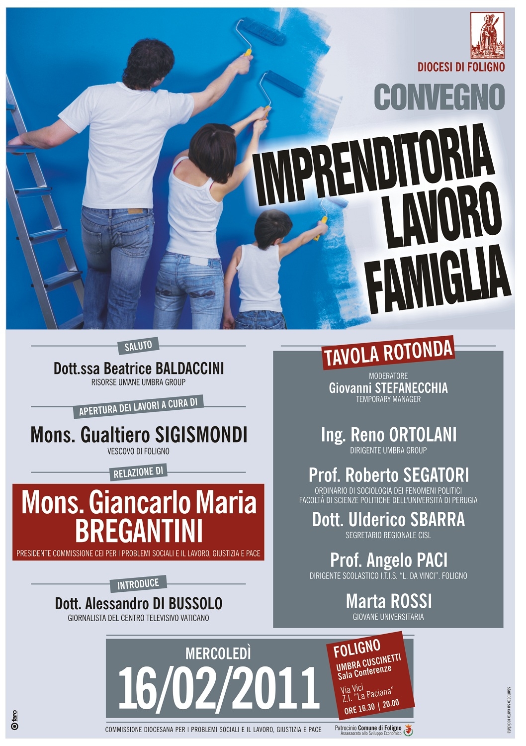 Mercoledì 16 febbraio alle ore 16.00 presso la Sala conferenze dell'Umbria Cuscinetti S.p.A (Zona industriale La Paciana di Foligno), si apre il convegno organizzato dalla Commissione per i problemi sociali e il lavoro della Diocesi di Foligno dal titolo "Imprenditoria, Lavoro, Famiglia". La presenza di S.E. Mons. Giancarlo Maria Bregantini Presidente della Commissione CEI per i problemi sociali e il lavoro giustizia e pace, che aprirà la giornata di studi, è un'occasione per riflettere sui possibili scenari economici, sociali e pastorali per i prossimi anni nel territorio sia locale che regionale. A seguire una tavola rotonda con la presenza del Dott. Ulderico Sbarra segretario regionale CISL, l’Ing. Reno Ortolani Dirigente Umbra Group, il Dott. Roberto Segatori Sociologo dell’Università degli Studi di Perugia, Marta RossiI giovane universitaria, il Prof. Angelo Pci dirigente scolastico I.T.I.S. “Leonardo Da Vinci” di Foligno.