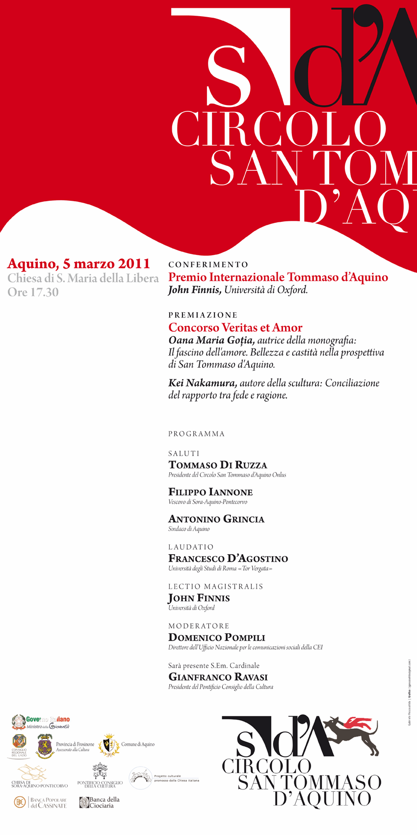 Il Circolo San Tommaso d’Aquino Onlus, organizza la seconda edizione del Premio Internazionale Tommaso d’Aquino che quest'anno verrà conferito, il prossimo 5 marzo alle 17.30 presso la Chiesa di S. Maria della Libera ad Aquino,  al prof. John Finnis; docente della Università di Oxford.