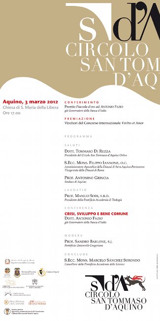 Oltre al Presidente Di Ruzza, saranno presenti S.E. Mons. Filippo Iannone e il Sindaco di Aquino Prof. Antonino Grincia. Il dott. Antonio Fazio terrà una relazione sul tema “Crisi, sviluppo e bene comune”.