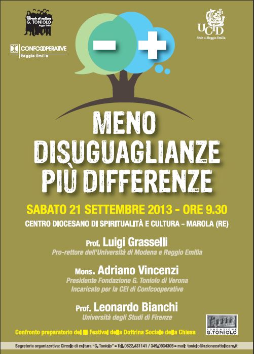 È partendo da questa considerazione che si svilupperà il confronto su “Meno disuguaglianze, più differenze” che il Circolo di cultura G. Toniolo, l’Ucid e Confcooperative Reggio Emilia hanno promosso per sabato 21 settembre al Centro Diocesano di Spiritualità di Marola, sull’Appennino reggiano.