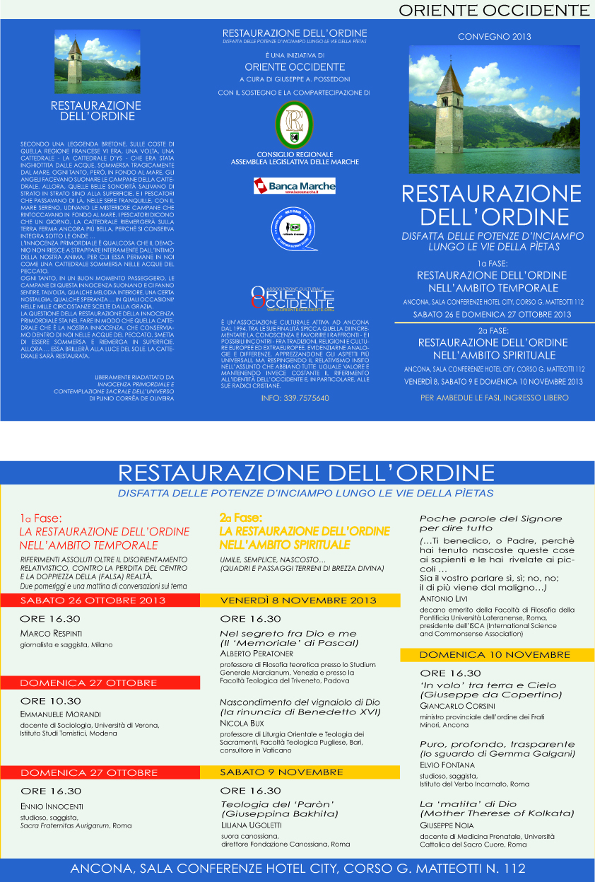 Il Centro Studi Oriente e Occidente di Ancona organizza per le giornate del 26 e 27 ottobre il Convegno "Restaurazione dell'ordine nell'ambito temporale".