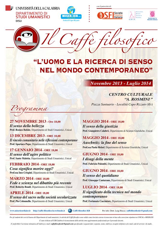 L’uomo e la ricerca di senso nel mondo contemporaneo. Questa l’importante traccia del “Caffè filosofico” che si svolgerà presso il Centro culturale “Antonio Rosmini” di Capo Rizzuto, dal 27 novembre prossimo al mese di luglio 2014.